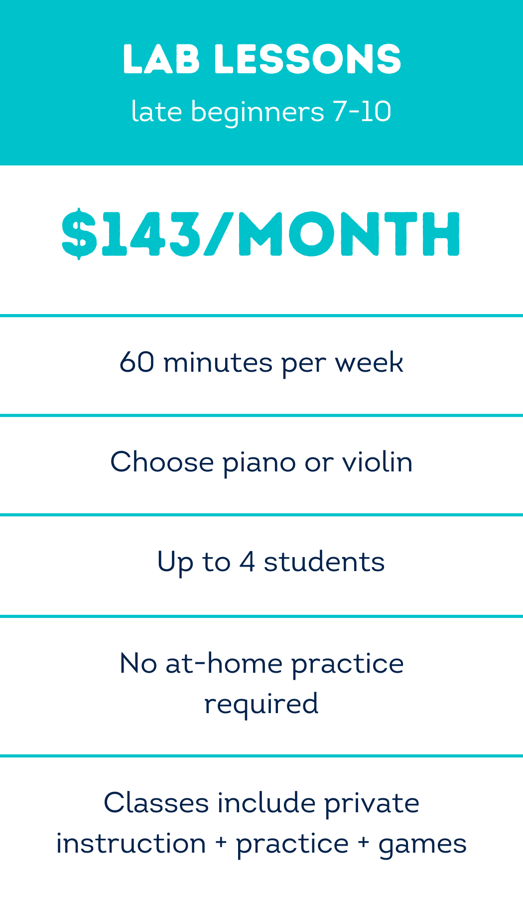 *If your child already took a full semester of beginner piano or violin, they should move to the next level, Piano Lab or Violin Lab.