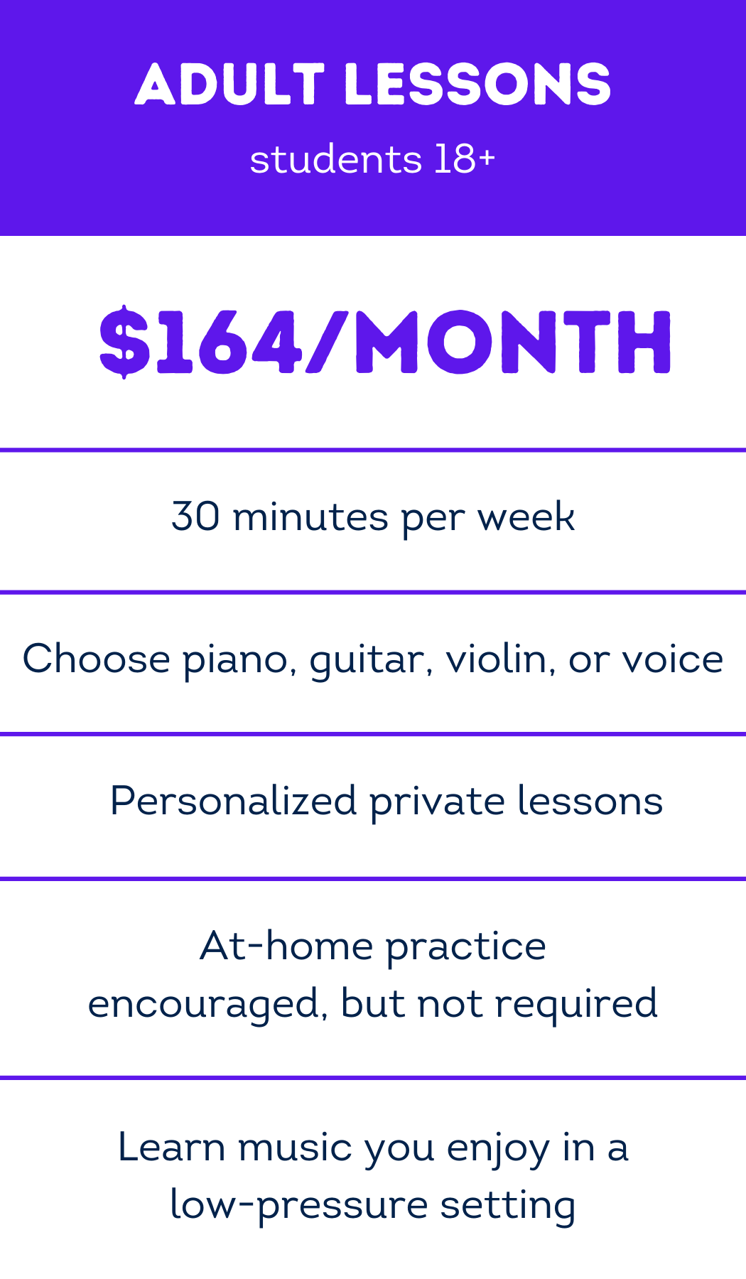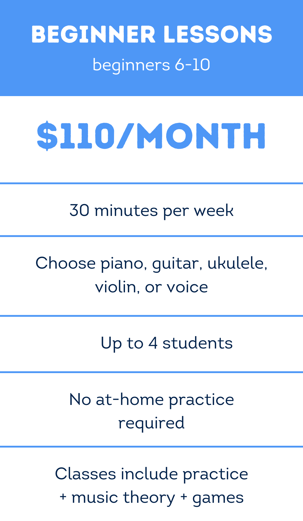 Beginner Lessons (30 min.): Piano, Guitar, Harp, Violin, Voice, Ukulele, Little Jammers (Ages 6-10)