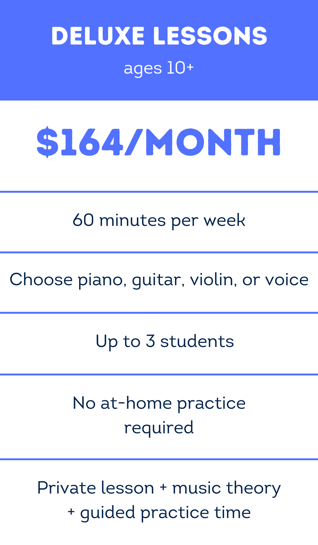 Deluxe Lessons (60 min.): Piano, Guitar, Violin, Voice, Ages 11-18